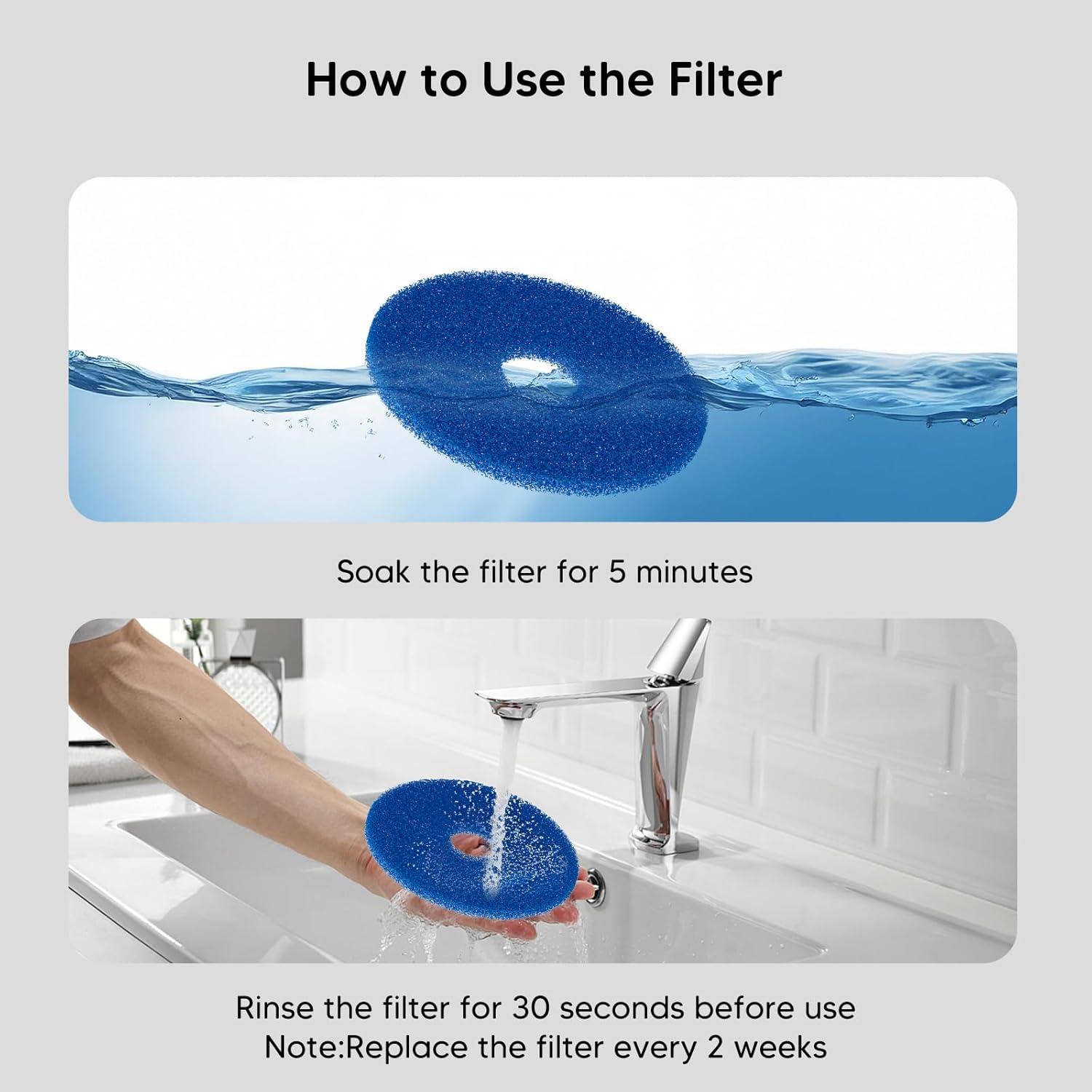 Friendly Tips-We recommended to replace the filters every 2 weeks to keep water running fresh and pure. Change the filter every 2 week will be healthier!