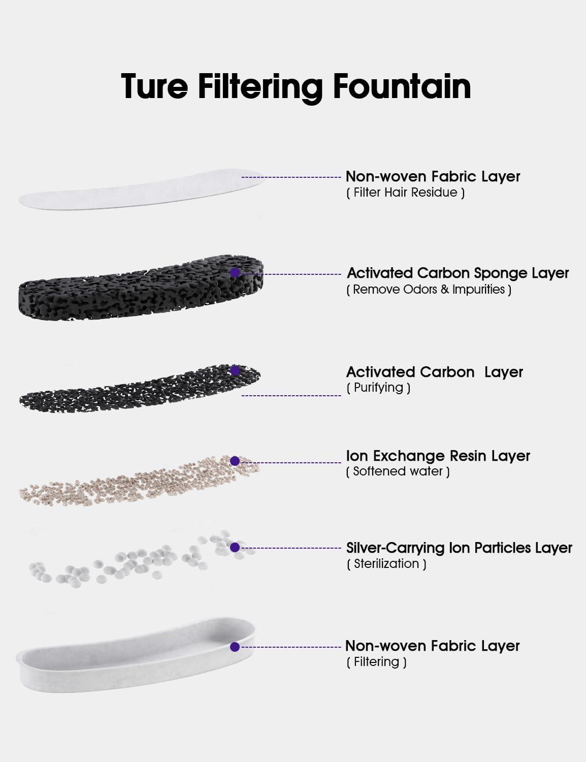 【Multiple Filtration System】 WOPET Pet fountain uses multiple filtration system. The carbon filter is made of various materials to effectively filter out dust, fine debris and soften the water. The pump filter attracts floating hair in the water dispenser. Purifying water your pets put into their tummy, drink without worries.For your pet's health and to ensure the fountain works properly, we recommend replacing the filter every 2 week.